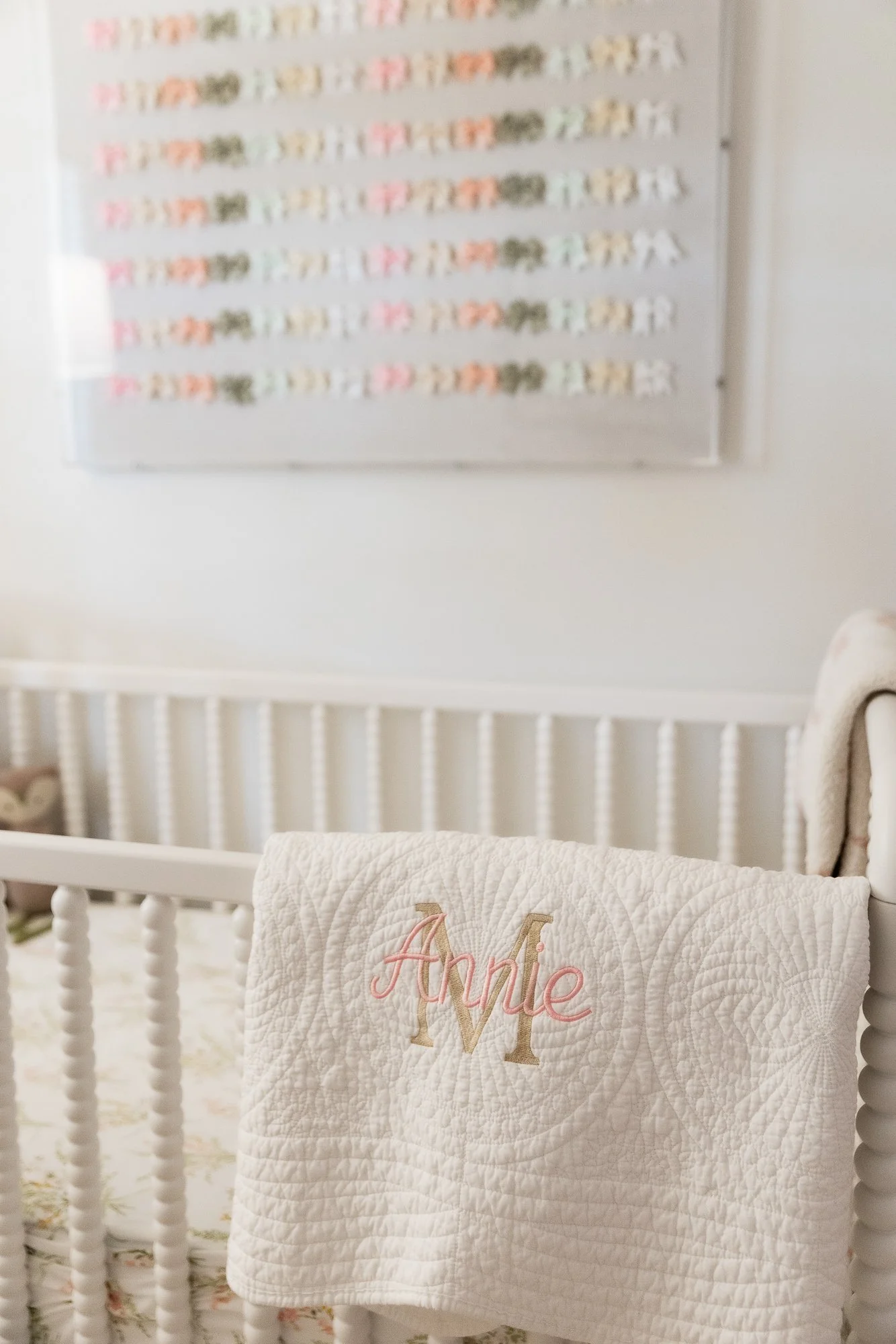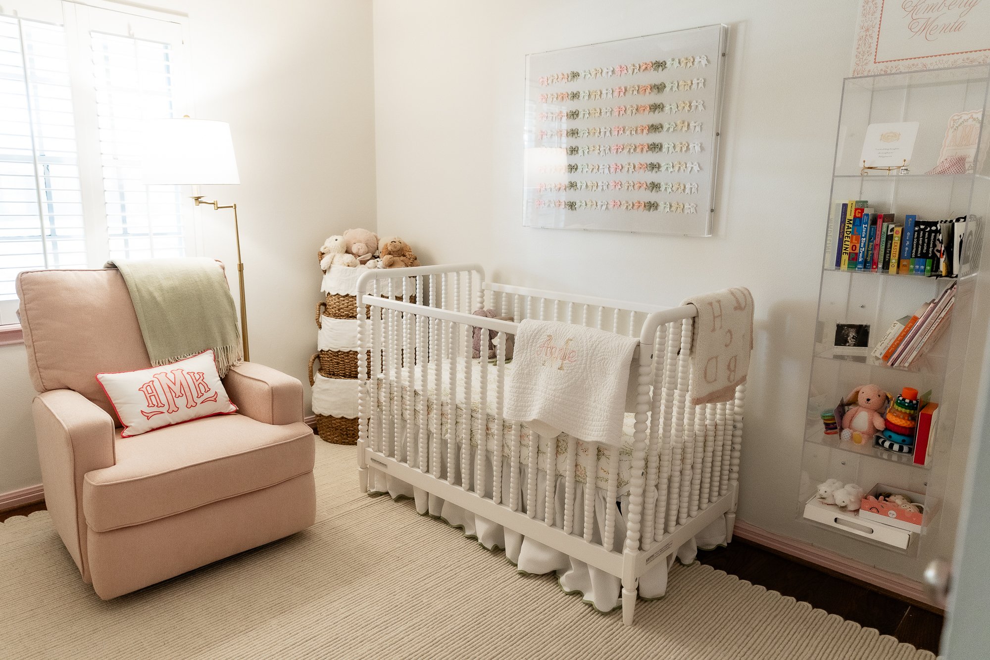 And their nursery… easily one of my favorites. Soft pinks and greens, the sweetest southern details, and so many thoughtful touches throughout. I just love the bow art, the monogrammed pillow, and the beautiful floral bedding.